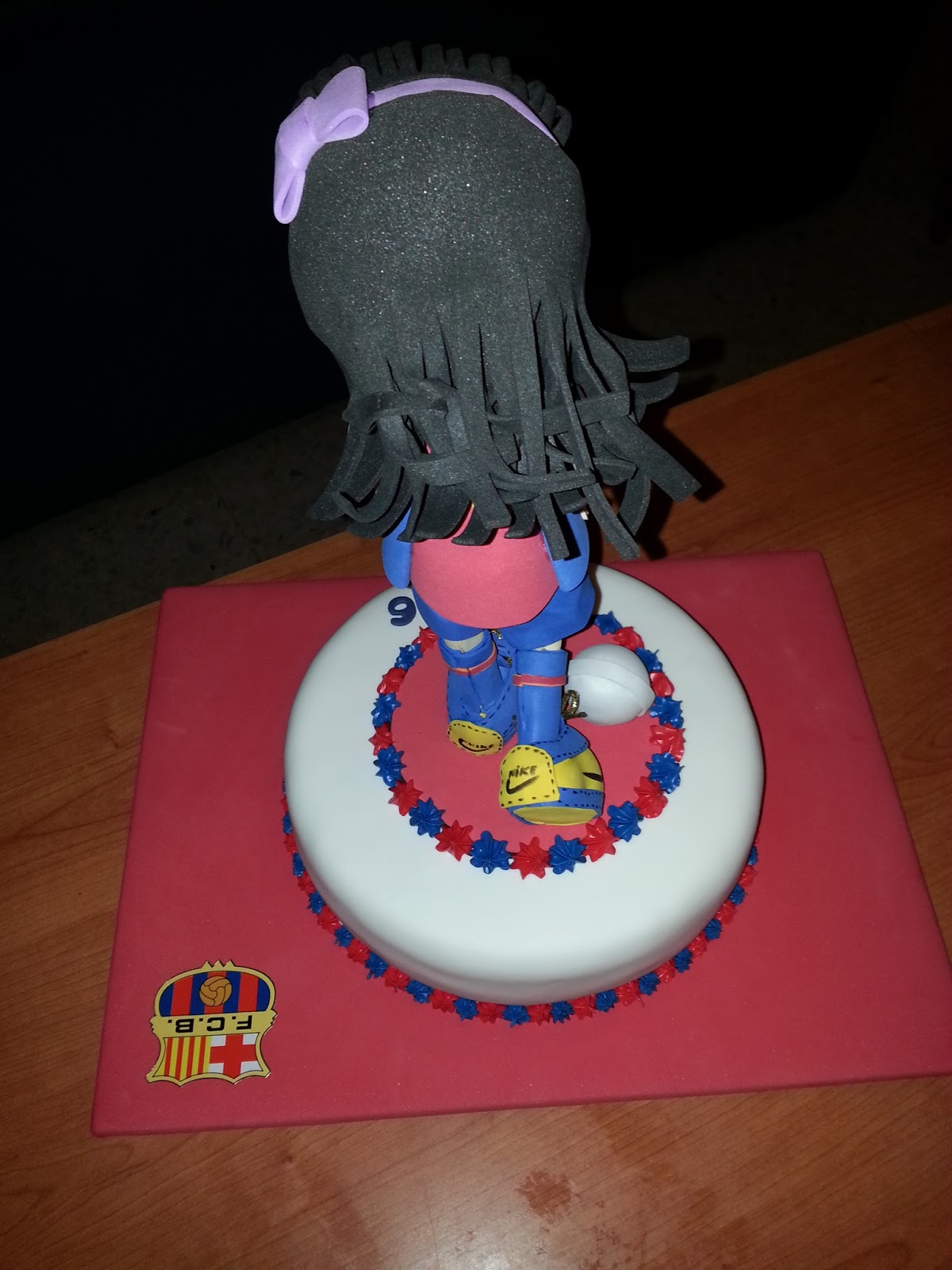 Pense en hacer la típica con el escudo pero no lo veía muy femenino, así que seme ocurrio hacer la tarta con una fofucha vestida con la equipación del Barsa.